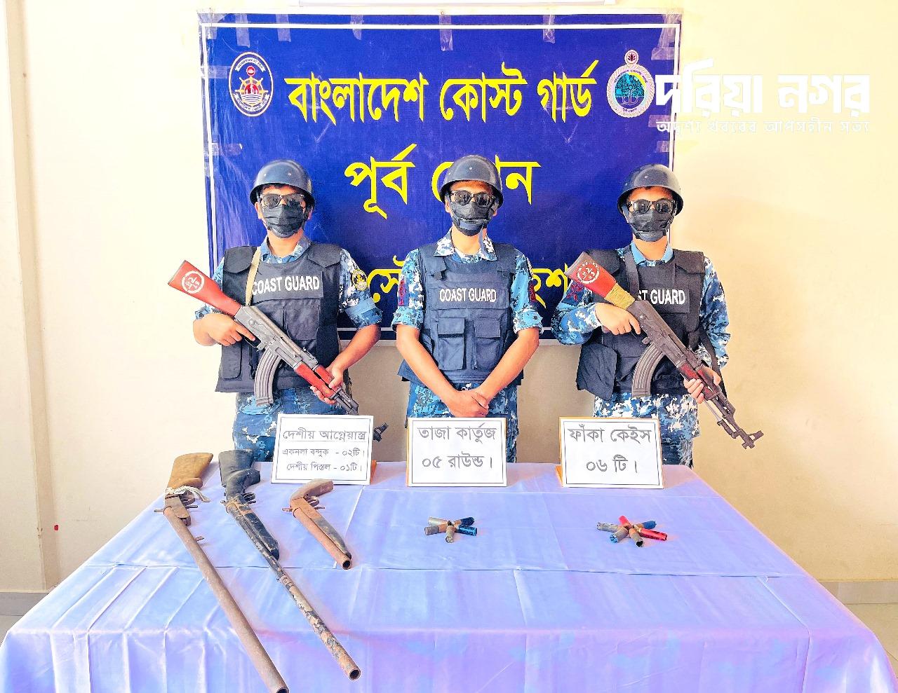 কক্সবাজারের মহেশখালীতে ৩ টি দেশীয় আগ্নেয়াস্ত্র ৫ রাউন্ড তাজা গোলা ও ৬ রাউন্ড ফাঁকা গোলা জব্দ করেছে কোস্ট গার্ড।