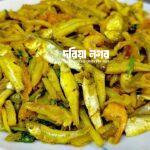 প্রথমে যে পাত্রে রান্না করবেন সেখানে ভালো করে আধা কাপ কুচানো পেঁয়াজ, ৪/৫টা কাঁচা মরিচ, স্বাদমতো লবণ লবণ দিয়ে ও দুই টেবিল চামচ সরিষার তেল দিয়ে ভালো করে মেখে নিতে হবে, যেন মাখানো মশলাগুলো নরম হয়ে আসে। চাইলে পেঁয়াজ ও কাঁচা মরিচ থেঁতো করে নেওয়া যেতে পারে।