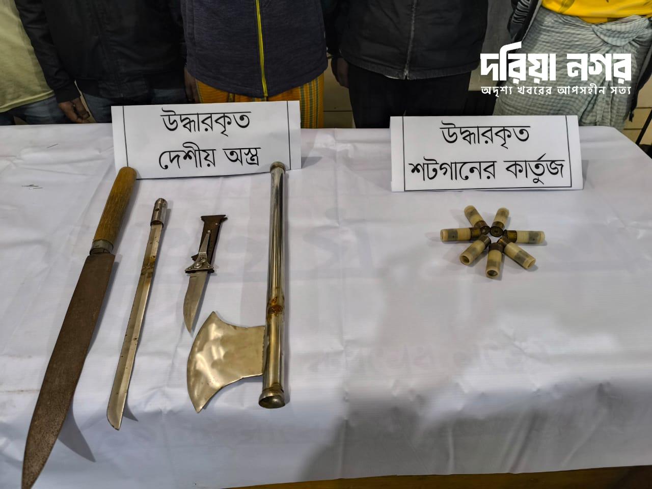 এ সময় তাদের তল্লাশি করে সাত রাউন্ড রাবার বুলেট, একটি স্টিলের চাইনিজ কুড়াল, একটি দেশীয় তৈরি লোহার ছুরি, একটি পুরাতন টিপ ছুরি, একটি স্টিলের তৈরি ছুরি উদ্ধার করা হয়।