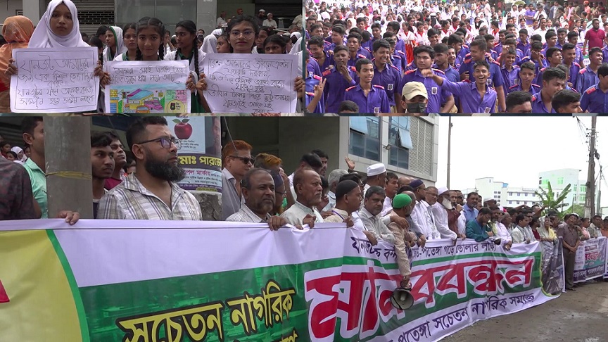 বৃহস্পতিবার (২৪ জুলাই) দুপুরে নগরীর সল্টগোলা এলাকায় শিক্ষার্থী ও স্থানীয়রা ছাড়াও মানববন্ধনে অংশ নেন বেশ রাজনৈতিক, সামাজিক ও বেশ কয়েকটি সাংস্কৃতিক সংগঠনও।