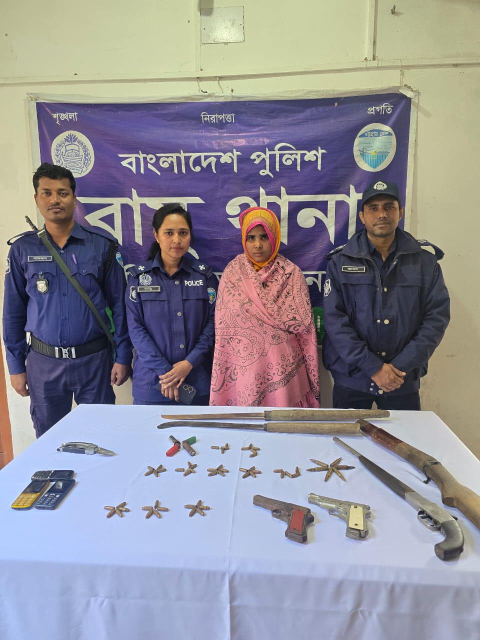 ওসি মনিরুল ইসলাম জানান, একটি বসতঘরে অপরাধমূলক কাজে ব্যবহারের উদ্দেশ্যে আগ্নেয়াস্ত্র মজুদের গোপন সংবাদের ভিত্তিতে যৌথ বাহিনী অভিযান চালায়। অভিযানের সময় সন্দেহভাজন বসতঘরটি ঘিরে ফেললে ৩ থেকে ৪ জন কৌশলে পালিয়ে যায়। এ সময় ঘর থেকে এক নারীকে আটক করা হয়। পরে তল্লাশি চালিয়ে বিশেষ কৌশলে লুকিয়ে রাখা অবস্থায় ২টি বিদেশি পিস্তল, ১টি দেশীয় তৈরি বন্দুক, বিভিন্ন ধরনের ৫৫টি গুলি, ৪টি খালি কার্তুজের খোসা, ১টি বন্দুকের বাট, ১টি খেলনার পিস্তল, ২টি লম্বা দা ও ১টি কাটার উদ্ধার করা হয়।