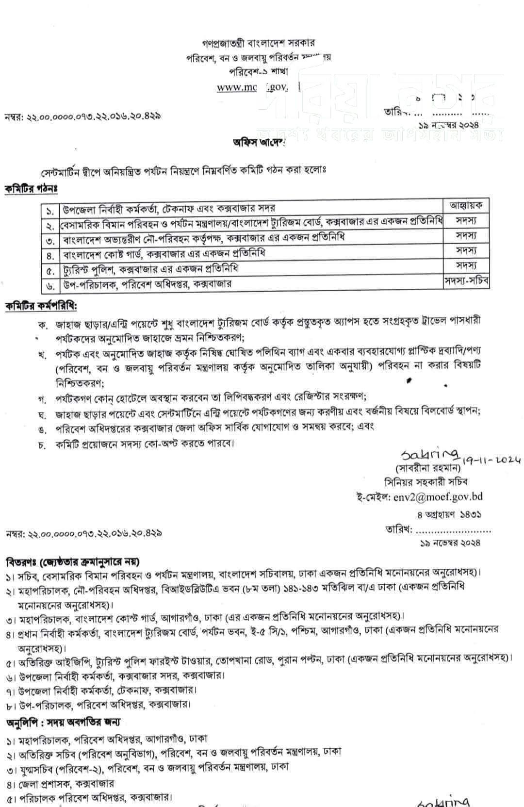 অফিস আদেশে বলা হয়, সেন্ট মার্টিন দ্বীপে অনিয়ন্ত্রিত পর্যটন নিয়ন্ত্রণে কমিটি গঠন করা হয়েছে। কমিটির আহ্বায়ক হিসেবে থাকবেন কক্সবাজার সদর এবং টেকনাফ উপজেলা নির্বাহী কর্মকর্তা। সদস্য সচিব থাকবেন কক্সবাজার পরিবেশ অধিদপ্তরের উপপরিচালক।