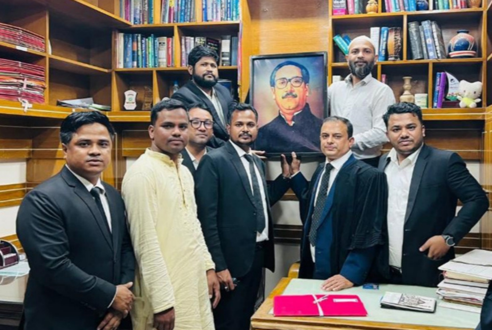 আইনজীবী মোহাম্মদ জুলকারনাইন জিল্লু জানান, কয়েক বছর আগে সহপাঠী হিসেবে একসঙ্গে চেম্বার শুরু করার সময়ই তারা বঙ্গবন্ধুর ছবি টাঙিয়েছিলেন। এমনকি সে সময় ছবির জন্য আলাদা ফ্রেমও তৈরি করা ছিল। তিনি দাবি করেন, গত ৫ আগস্ট-পরবর্তী সময়ে ‘জুলাইযোদ্ধা সমন্বয়ক’ পরিচয়ে কিছু ব্যক্তি জেলা জজ আদালত এলাকায় হামলা ও ভাঙচুর চালায়। সে পরিস্থিতিতে নিরাপত্তাজনিত কারণে তারা ছবিটি সরিয়ে রাখেন।